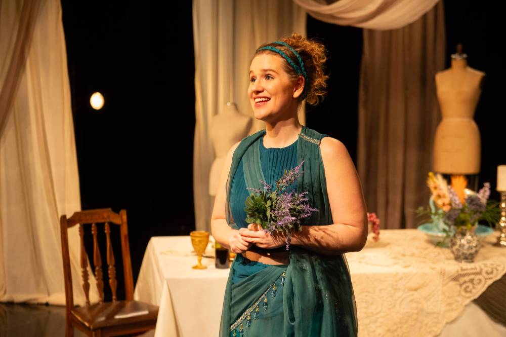 When Ardern, who wrote and performs each role, enters the fray, she is barefoot. And before grabbing the microphone as the seer Cassandra, the actor wraps one of the dress forms in a teal shroud. From this moment onward, each perceived “object” on stage is cast as a potential stand-in for humankind — a jug becomes the body and the wine inside the soul.
