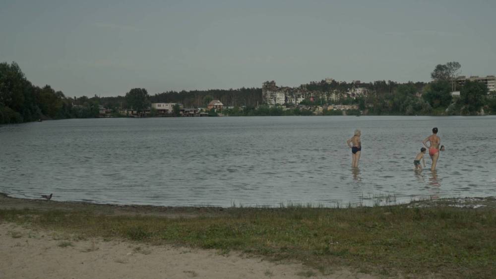 Ukrainian voices are not heard, but we see Ukrainian citizens rebuilding their homes and daily lives, and children playing despite the devastation caused by the invasion.