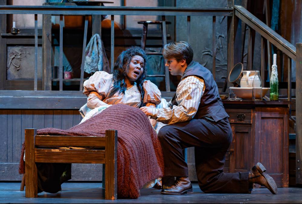Mark Rash photo Suzanne Taffot’s ailing Mimi sings from her sickbed to her love Rodolfo, played by tenor Zachary Rioux.