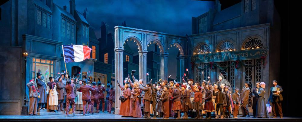 The Manitoba Opera Chorus (Tadeusz Biernacki, director) and Children’s Chorus (Carolyn Boyes) light up the Paris night sky during Act III’s Christmas Eve street scene, their delivery as crisp as the gendarmerie’s rat-a-tat military drums during chorus Aranci, datteri! Caldi i marroni! (which includes a cameo by toy vendor Parpignol, played by George Nytepchuk).