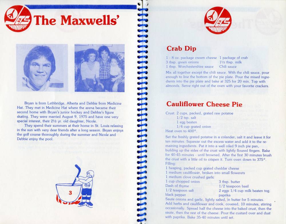 Defenceman Bryan Maxwell and wife Debbie shared their Crab Dip recipe in the cookbook. After meeting in a Medicine Hat arena, where he played junior hockey and she figure skated, the pair spent three seasons in Winnipeg with their firstborn, Nicole.