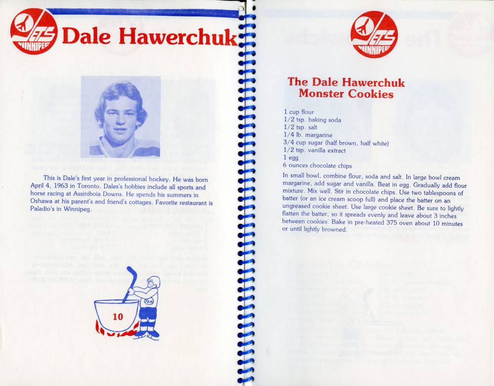The Dale Hawerchuk Monster Cookie was the left-handed centre’s contribution to The Jets Are Cookin’, a spiral-bound cookbook assembled by the wives of the Winnipeg Jets featuring dozens of family recipes from players, coaches and administrative staff. (Taking the lead was Gail Long, wife of blueliner Barry Long, a two-time AVCO Cup winner with the Jets who retired from professional hockey following the 1982 season.)