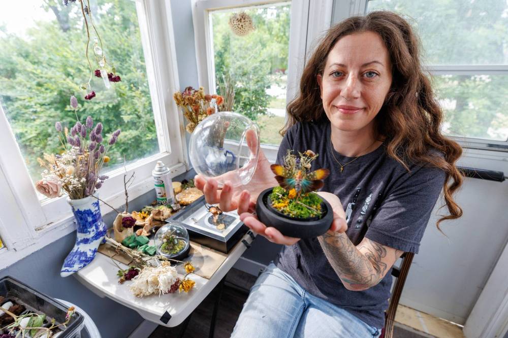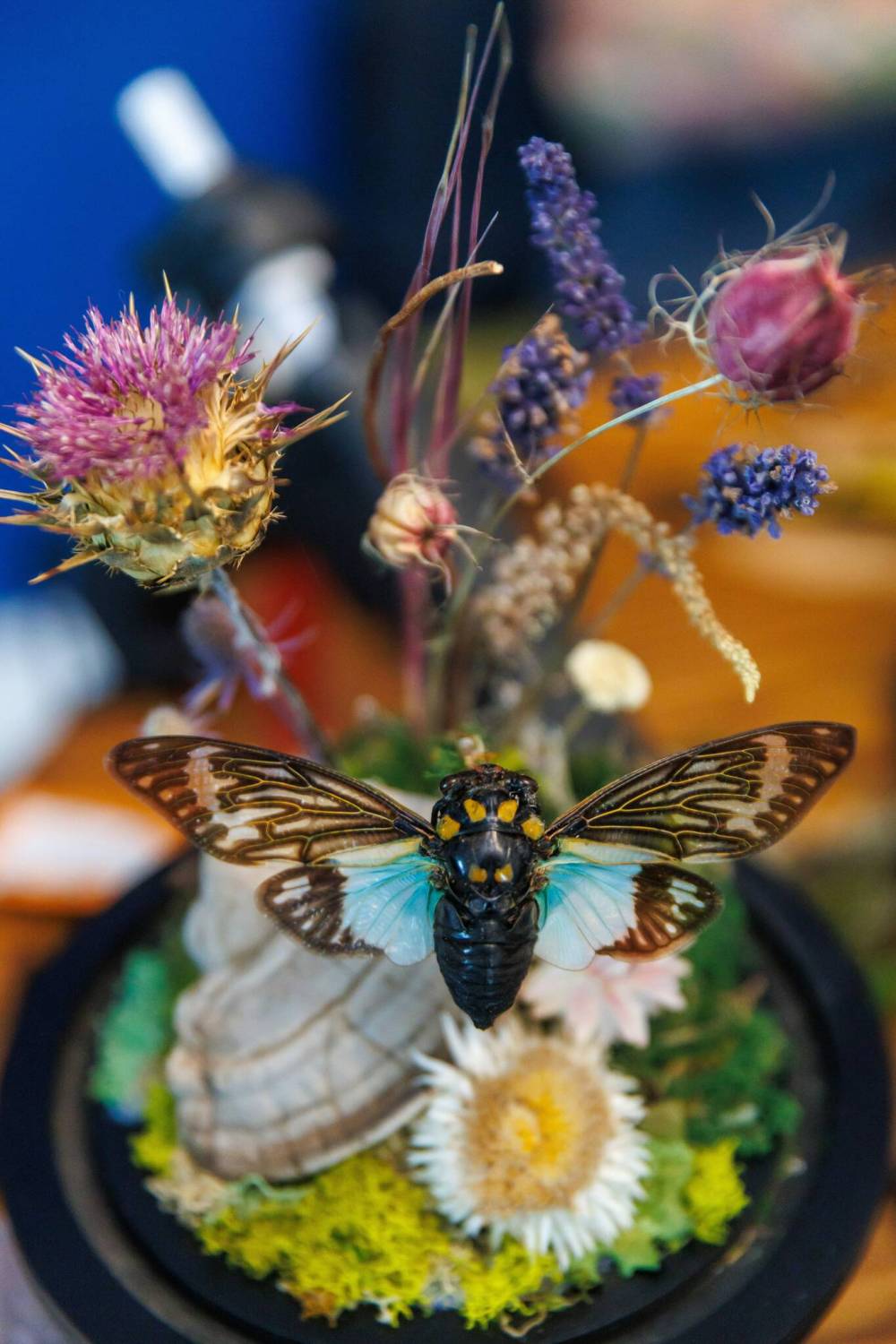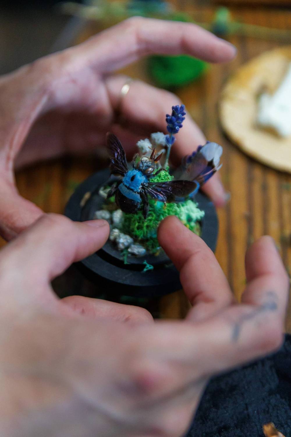Her first few creations were minimalist in nature — a lone dead bug in a container with a rock, a butterfly pinned on a flower stem — a far cry from more her recent pieces, which are smaller, more intricate and detailed, containing anything from 10 to 25 different elements including honeycomb, crystals, petrified wood and tree bark. Commissioned pieces will include whatever her clients request — as long as she is able to source the materials.