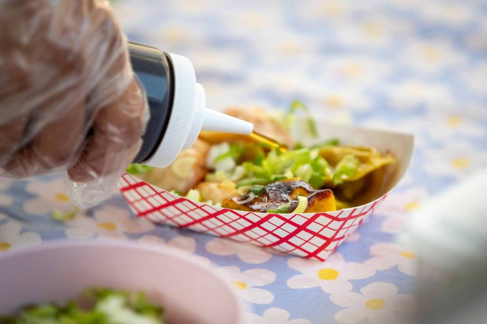 Li adds a squirt of garlic-vinegar sauce to dumplings while working at his Wolseley Farmers’ Market booth.