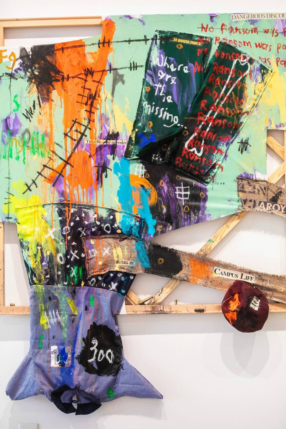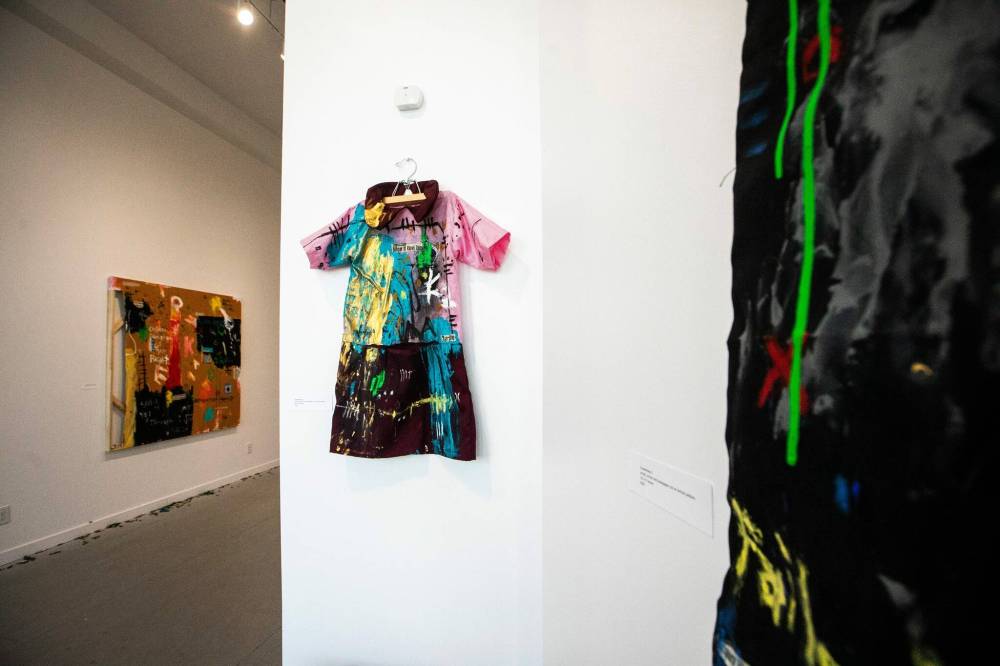 Andu’s art is not confined to the walls. On the floor below the canvases are mounds of clothing. A single shoe. A forgotten school cap. Left behind in the haste of escape, one hopes, though the reality is likely far more bleak.