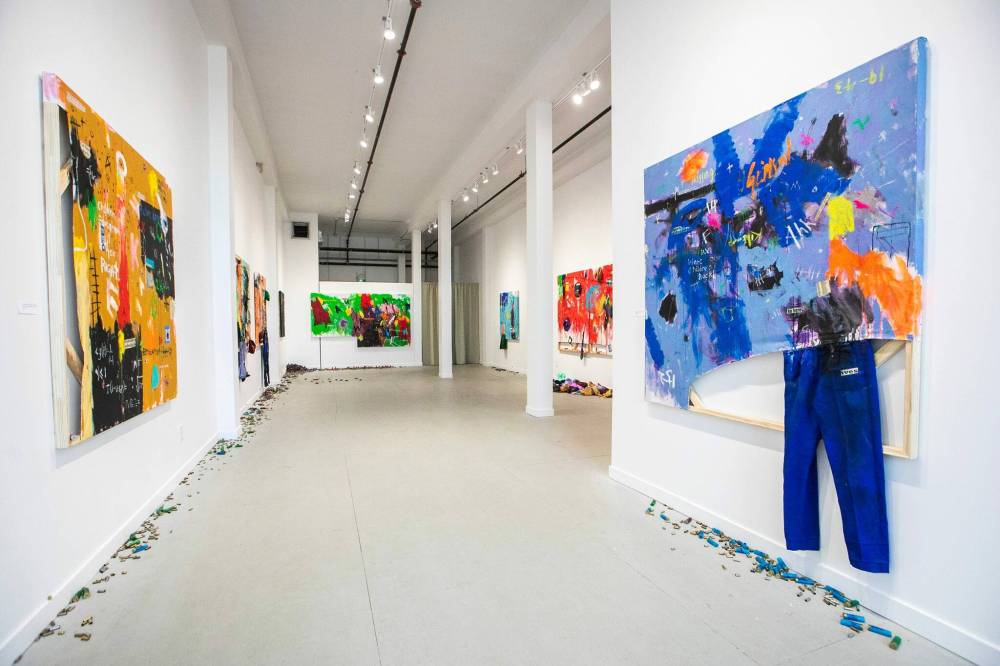 On the gallery’s walls are large canvases that evoke classroom blackboards, giving the sense of lessons interrupted by violence. Some of them have bullet holes. Others have splatters of paint that look disconcertingly like blood.