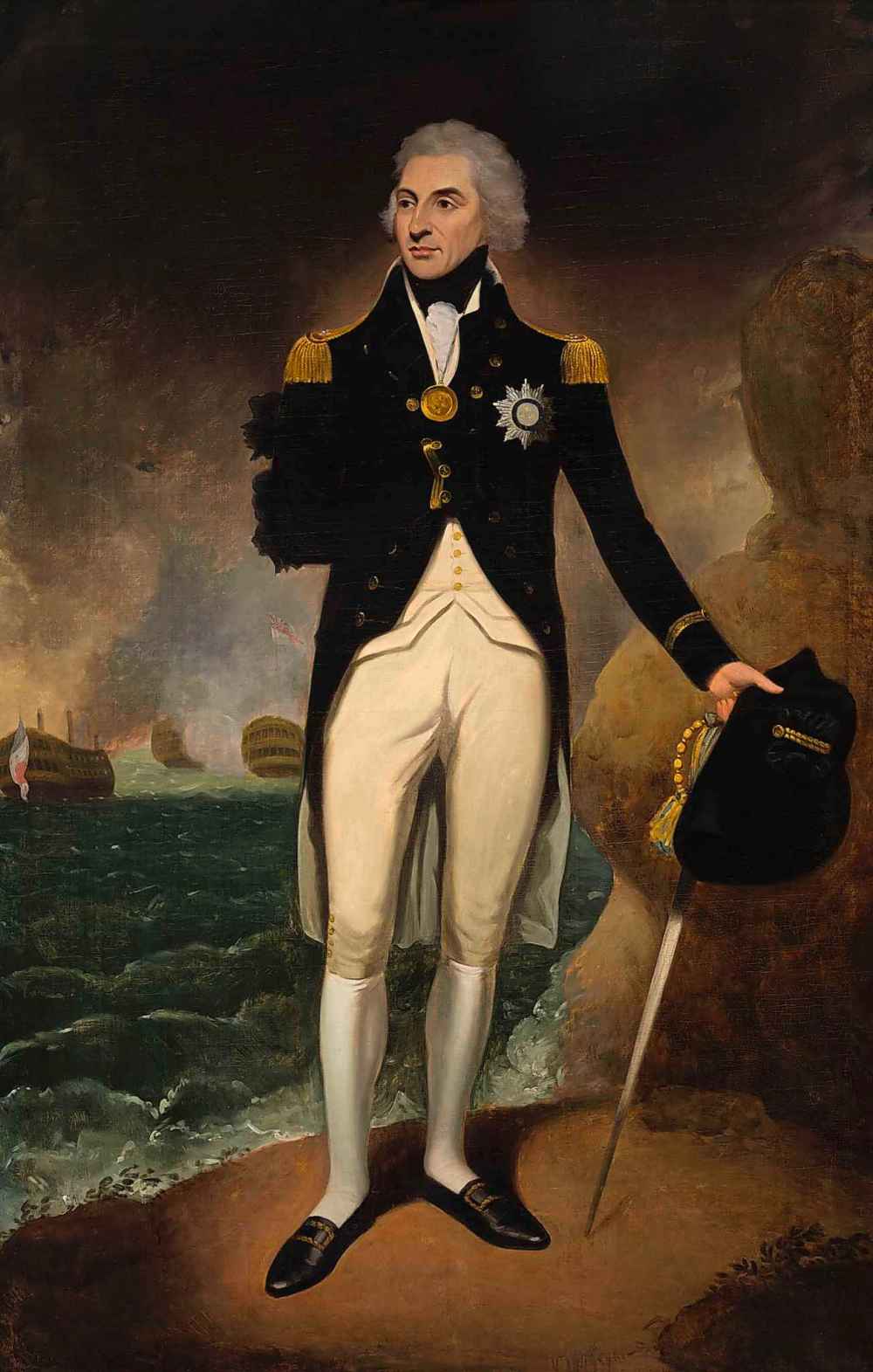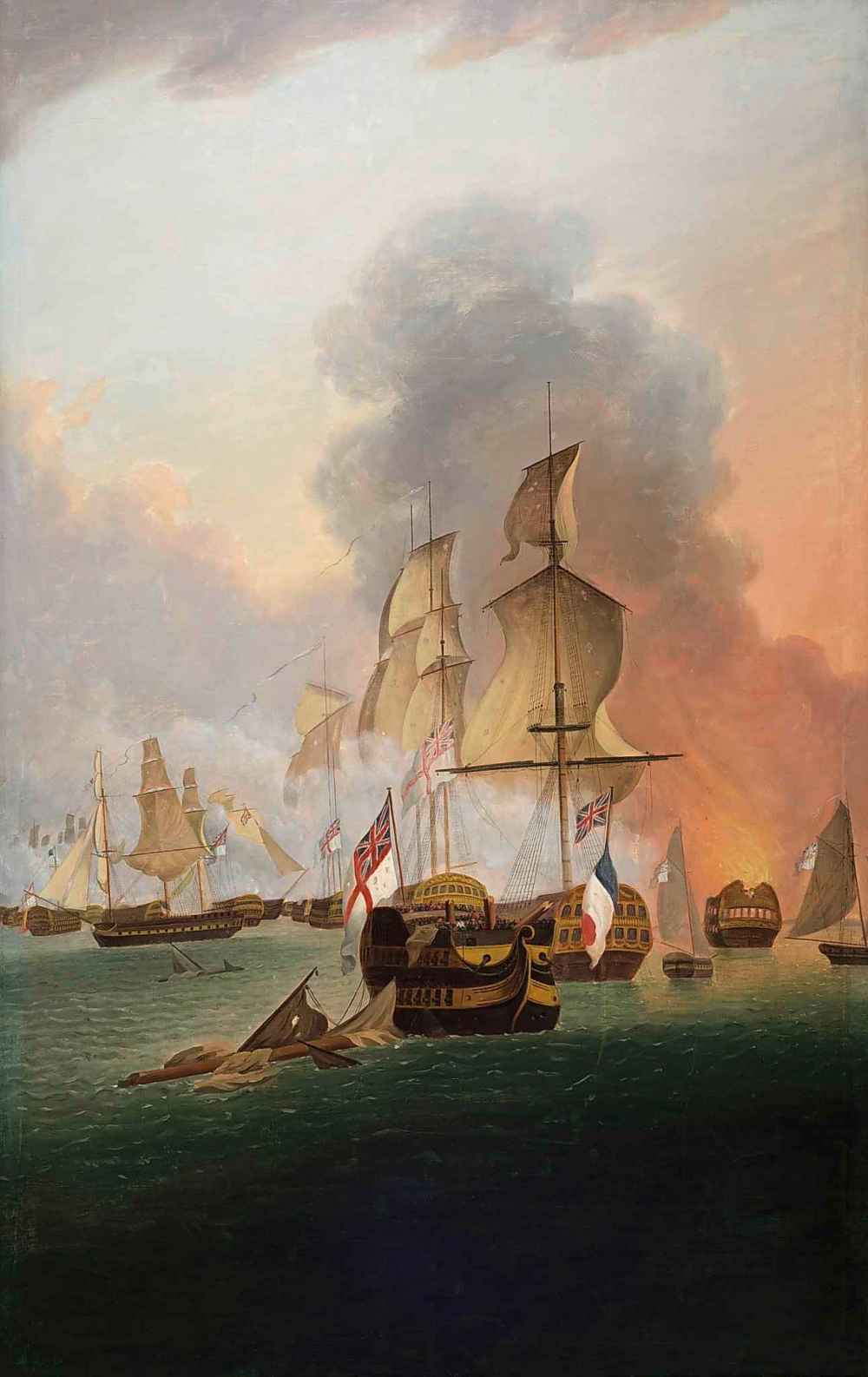 The first, the “Battle of Trafalgar,” features several war ships floating in the water by a fiery blaze, filling the air with smoke and an orange haze in a scene from the famous British naval victory. The second, “Rear Admiral Lord Horatio Nelson,” depicts the man who helped win the 1805 battle, in which he died.