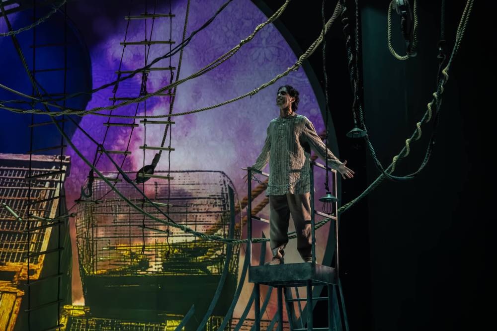 Kadri’s razor-sharp direction ensures that the 14-member ensemble is as tightly knitted as a sailor’s knot. All save Malhi portray multiple characters, including Winnipeg’s Kevin Klassen, whose chameleonic artistry flip-flops between Act I’s benevolent Father Martin and the ship’s heavily tatted cook, who cruelly mocks the Patels’ vegetarianism.