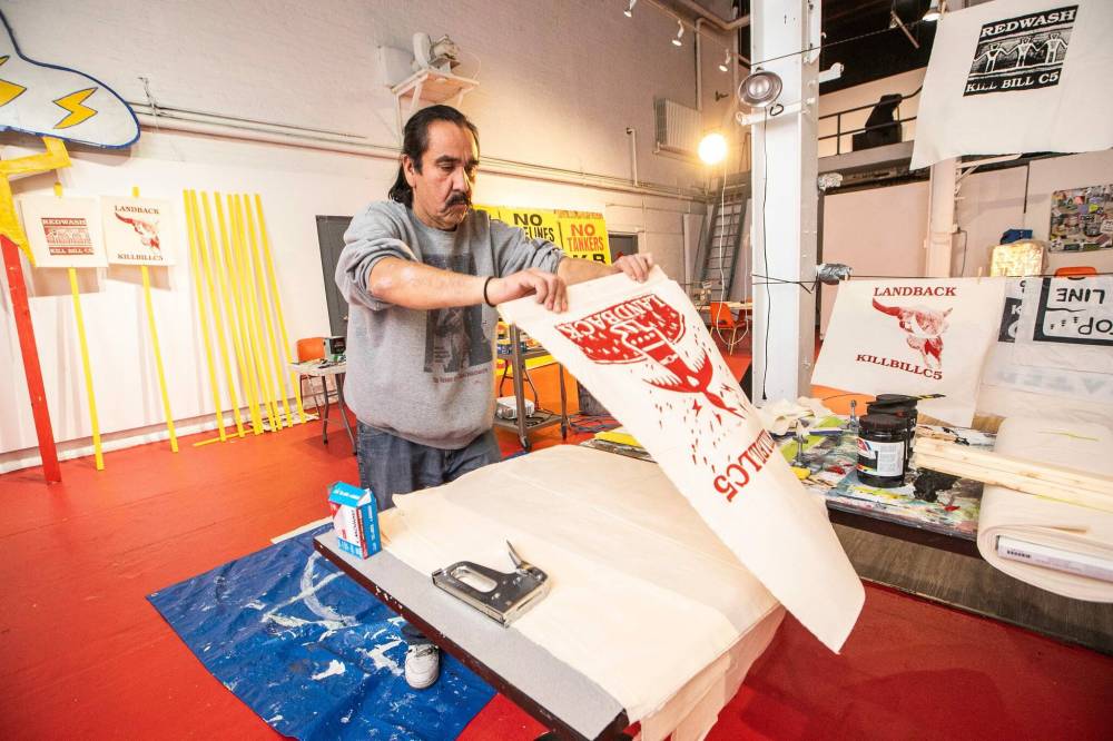 As he speaks, artist Jedrick Thorassie walks through the warehouse gallery on Higgins Avenue, barely visible behind the massive painting he carries, showing a bulldozer labelled “Bill C5” ravaging a pristine landscape.