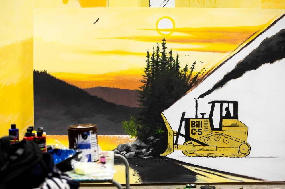A bulldozer labelled ‘Bill C5’ ravages a pristine landscape in one of Jedrick Thorassie’s works (in progress) for the Red Wash Stand exhibit.