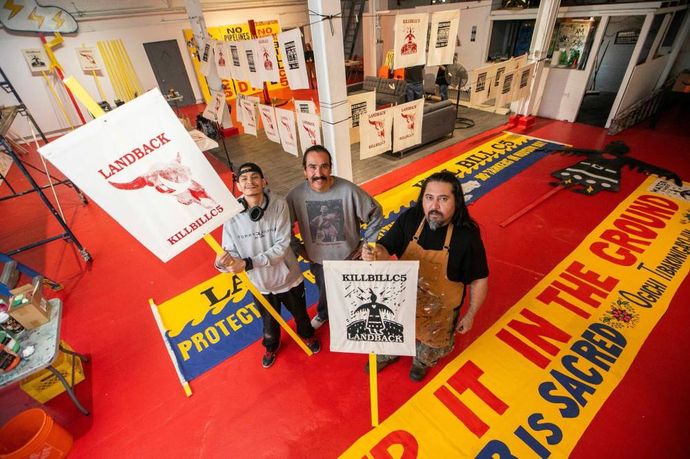 Artists Jedrick Thorassie (from left), Clayton Thomas-Müller and Raul Gonzalez prepare for the opening of the Red Wash Stand exhibit at Graffiti Gallery.