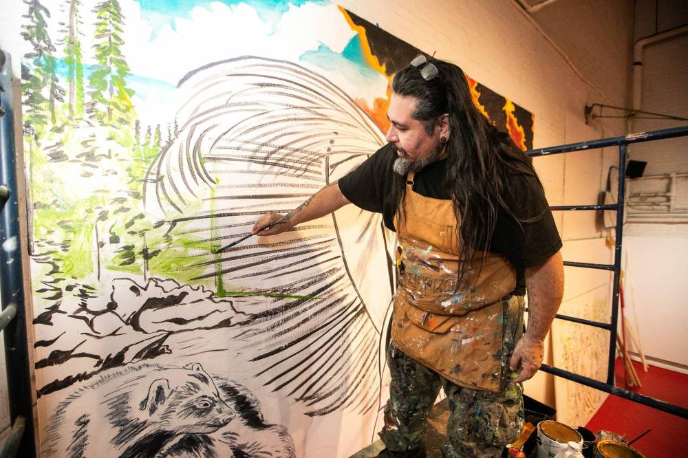 He’s working on a mural that excoriates Syncrude, one of Canada’s largest oil producers, and its attempts to gain “social credit” by positioning itself as an ally to Indigenous communities.