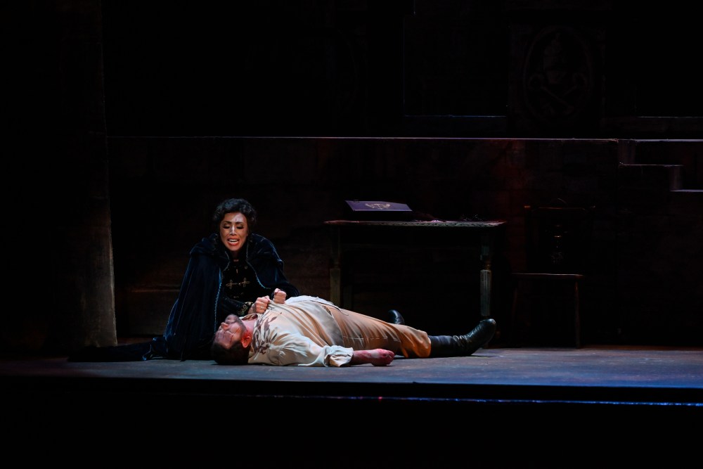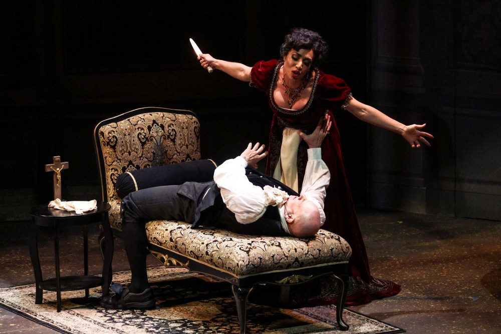She proves especially strong during Act II’s interrogation scene, in which Scarpia cruelly bullies her into submission, her rising desperation palpable. She finally takes matters into her own hands, literally, as she repeatedly stabs her tormentor in the heart.