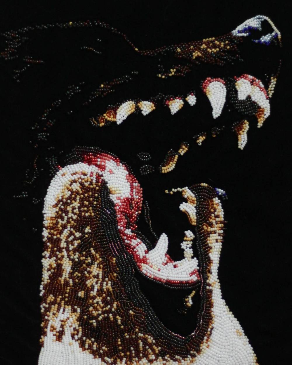 Curated by Julia Lafreniere with assistance from Michael Miteku, the exhibition is composed of 11 beaded works striking in both their detail and their viscerality.