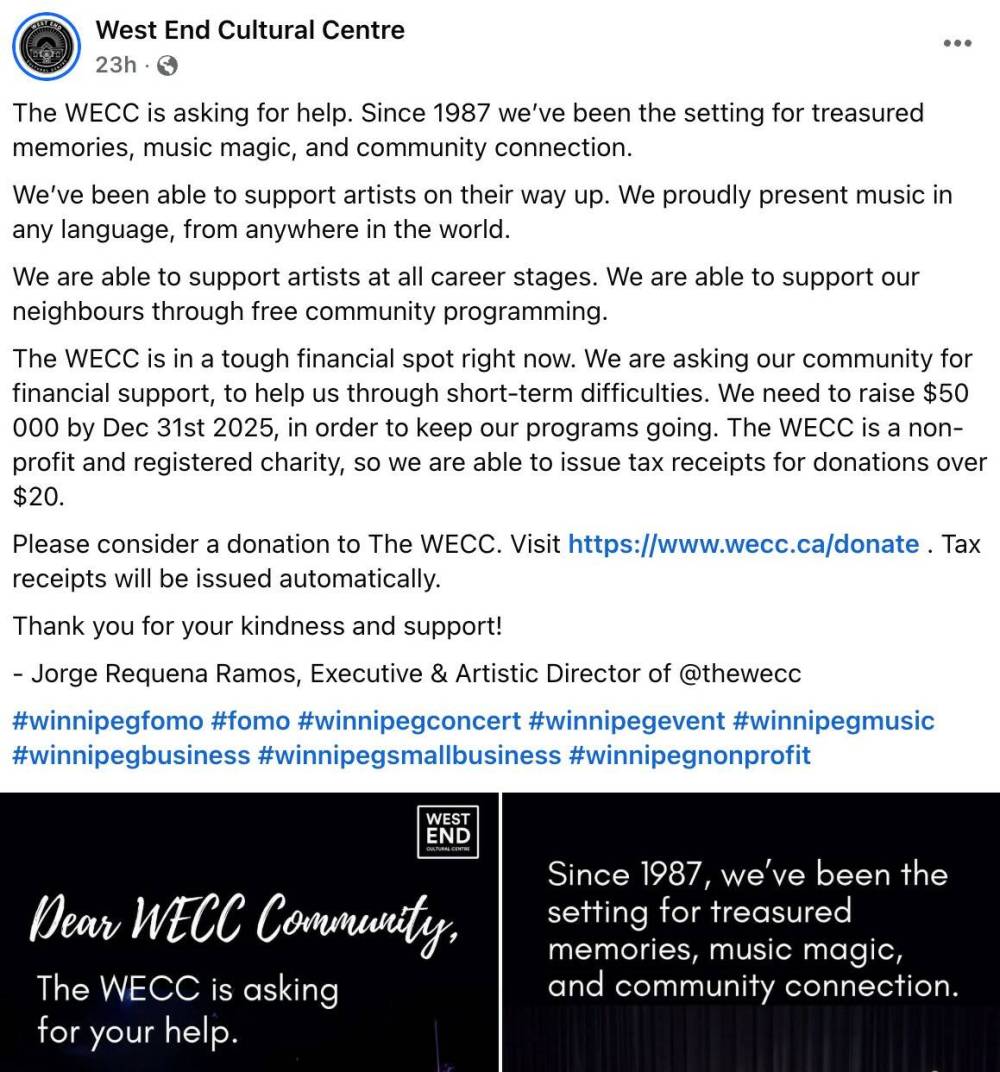 The West End sent an email out over the weekend and posted a lengthy Facebook message outlining the venue’s financial situation. The appeal is chock-full of warm quotes about the WECC by well-known local musicians such as Don Amero and David Landreth, placing the WECC at the centre of Winnipeg’s musical and cultural life.