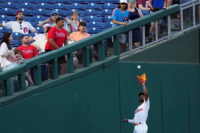 Philadelphia Phillies left fielder Andrew McCutchen catches a fly out by Miami Marlins' Trevor Rogers during the third inning of a baseball game, Tuesday, June 29, 2021, in Philadelphia. (AP Photo/Matt Slocum)