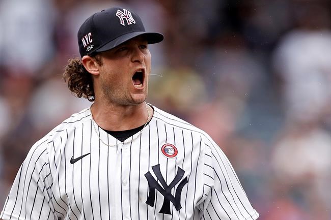 New York Yankees pitcher Gerrit Cole reacts after striking out New York Mets first baseman Pete Alonso to end the top of the third inning of the first baseball game of a doubleheader on Sunday, July 4, 2021, in New York. (AP Photo/Adam Hunger)