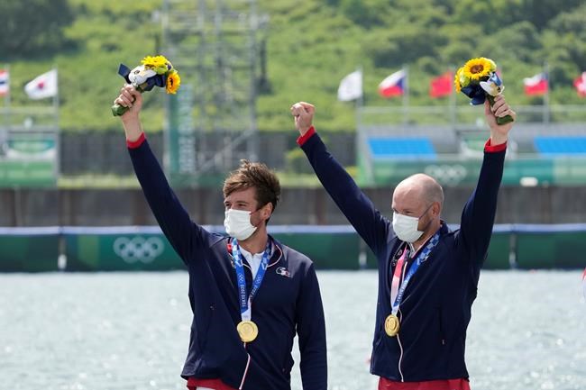The French team of Hugo Boucheron and Matthieu Androdias has held off a late charge from the Netherlands over the final 50 meters to win the men’s double sculls by 0.2 seconds in Olympic record time of 6 minutes, 33 seconds.