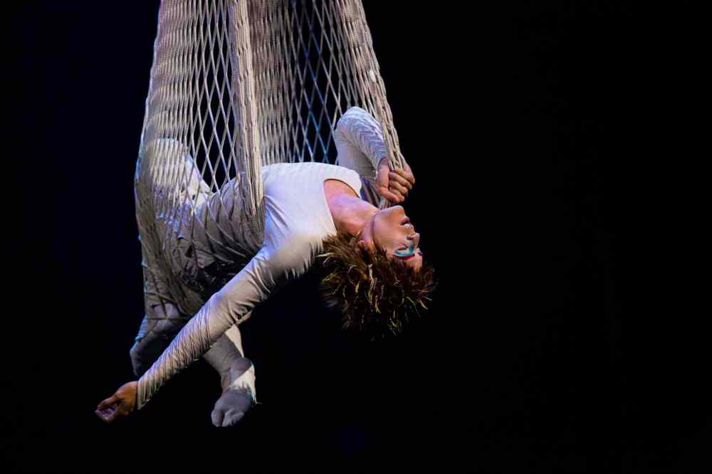 His wings now gone and his legs limp, the opening of the show features Icarus being hoisted into the sky wrapped in a net by his new forest friends who found him after his fall. Before long, a stunning aerobatic performance starts — Icarus winding and unwinding himself from the net, soaring through the air as his wrap is fashioned into wings. In his all-white clothing, he looked absolutely angelic.