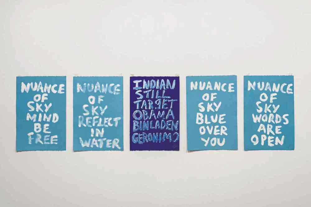 Eminent Southern Cheyenne artist Edgar Heap of Birds extends this breezy theme in four monotype prints reflecting on the “nuance of sky,” but he abruptly brings us down to earth with a fifth, slightly unhinged pronouncement: “Indian still target Obama Bin Laden Geronimo.”