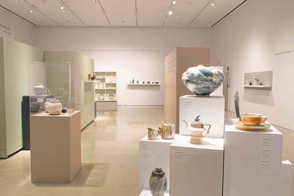 The installation itself is a warren of movable walls painted sage, taupe and dusty rose, which transform the cavernous exhibition space into a network of intimate, even domestic spaces that invite close consideration. Works by different artisans bump up against each other on clusters of plinths and under Plexiglas vitrines, the convivial clutter reminiscent of a packed cupboard or kiln shelf. The vessels hold their own as sculptures even as they practically cry out to be held and used.