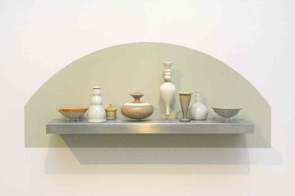 Catalogue essays sketch out the various lineages feeding into postwar pottery in this country, and the threads are easy to pick up in the jam-packed exhibition. A striking porcelain vase and tea set by Kathryne Koop feature stylized botanicals that nod to British textile designer William Morris and the anti-industrial Arts and Crafts movement, for instance, while the clean lines of Tam Irving’s almost futuristic shelf-top still lifes echo the utilitarian modernism of Bauhaus design.