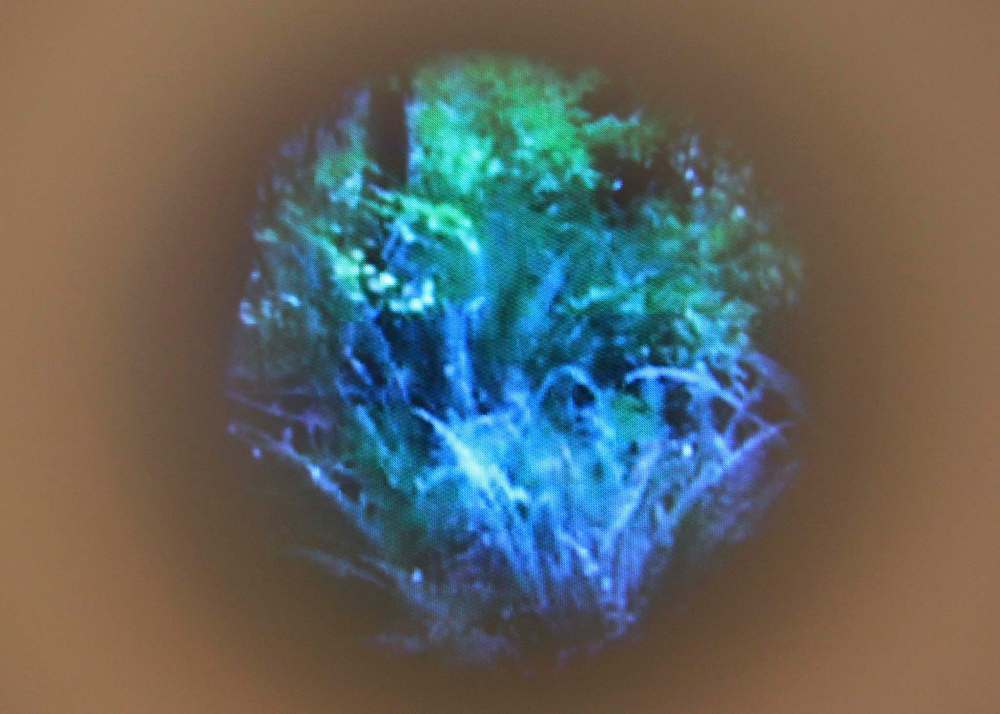 One of three such Apertures, the forest vignette recalls the “flashed face distortion effect,” or “ugly face illusion,” discovered by accident some years ago. The setup is simple: viewers stare at a fixed point while rapid-fire streams of faces (one version uses photos of Hollywood actors) flash by to either side. Unable to focus, the eye and brain do their best, inadvertently transforming half-seen faces in to grotesque caricatures, all teeth and eyes and monstrous jawlines. The effect is both alarming and instructive.