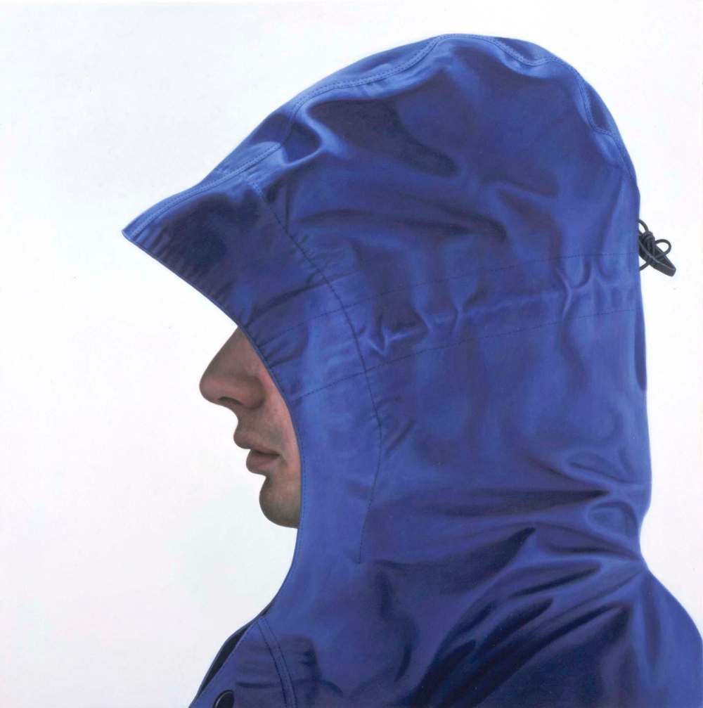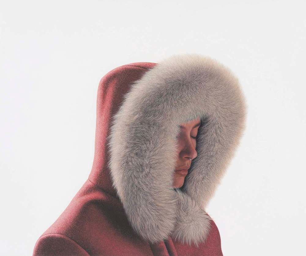 While his paintings are of 21st-century subjects — models wearing strategically wrinkled Gore-Tex outerwear — his technique of layering fine touches of acrylic paint on each other is influenced by Renaissance painters such as Albrecht Dürer, Funk said.