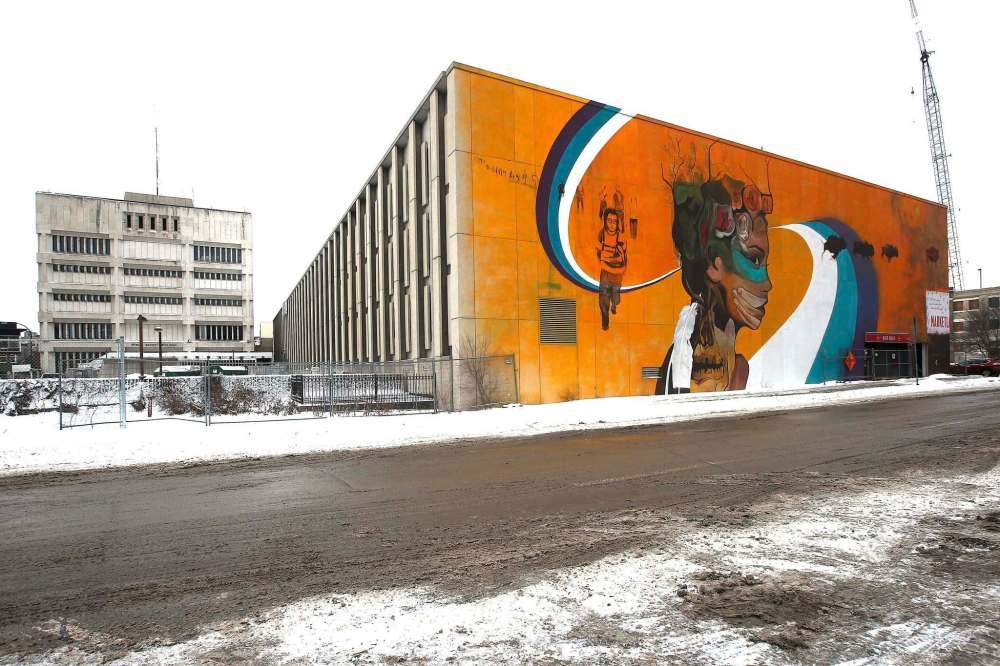 Nibaa (or “Sleep” in Ojibwe) is the name of the striking mural on the north side of the Public Safety Building parkade, on James Street, just north of city hall. It was created by local artist Mike Valcourt in 2017.