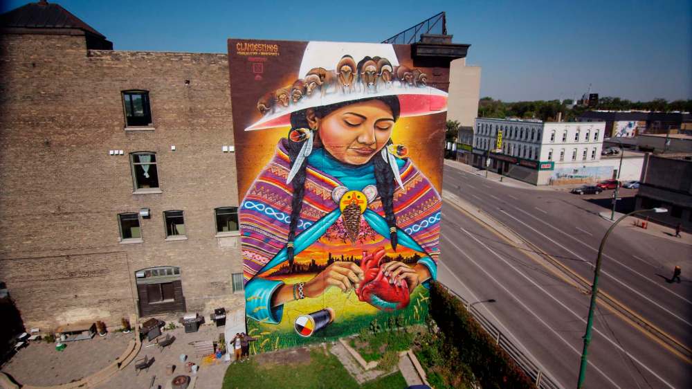 Mending, a 50-foot-tall mural on the high wall of Winnipeg Centre Vineyard Church, on Main Street just north of the Higgins underpass, depicts the head and shoulders of a black-haired Indigenous woman, wearing a bright-coloured shawl, handwoven in the Mayan style, with a hat crowned with a row of tiny visionary muskoxen of the North. Her shining hair is braided and woven with eagle feathers.