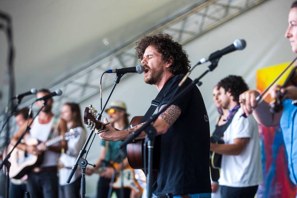 MIKAELA MACKENZIE / WINNIPEG FREE PRESS Jon Hembrey of the Strumbellas sings with Reuben and the Dark and Wild Rivers during a workshop at the Winnipeg Folk Fest on July 8.