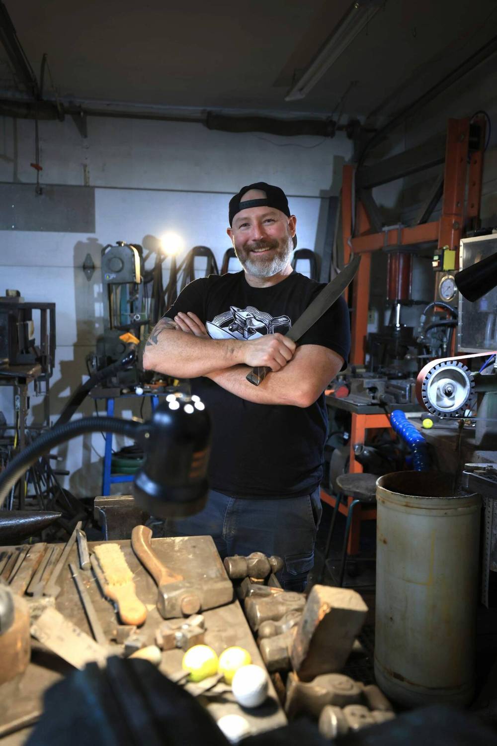 Justin Lamoureux is the current president of the Manitoba Blacksmith Guild and is also featured in a streaming TV show, Fire & Slice, which documents the process involved in crafting his custom knives. (Ruth Bonneville / Free Press)
