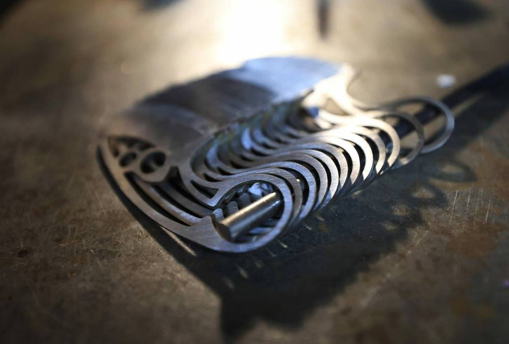 Stock removal is the most efficient — and advantageous — method of knife making. It requires less processing, as sheets of metal arrive annealed and ready for heat treatment. Lamoureux draws the shape of the blade on the steel before he sends it to be water-jetted, a method where a mixture of abrasives and high-pressure water stream are used to cut precise blades.