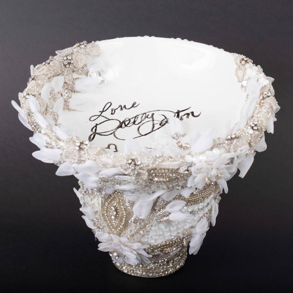 Parton’s creation — a white tiered bowl with flower and sequin embellishments from one of the country music star’s costumes — is available for upwards of $2,000 and comes with a backstory. The first bowl delivered to Parton arrived broken. The second got briefly lost in transit after being glazed and decorated by the singer.