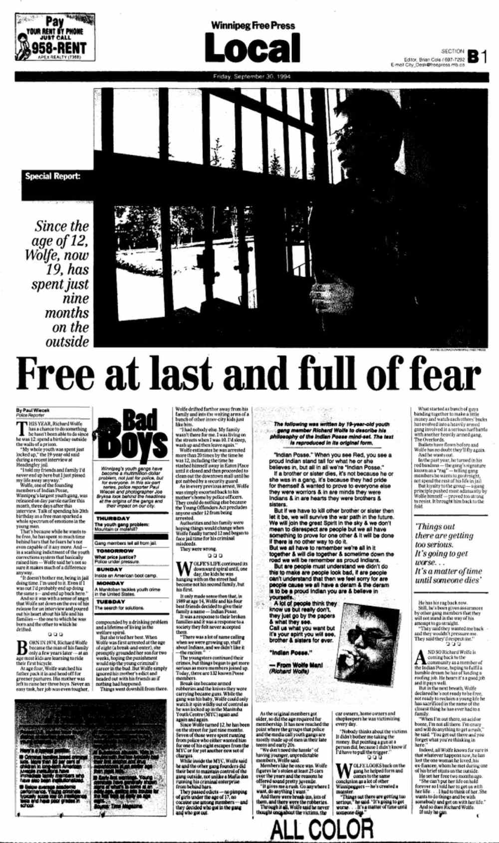 Indian Posse gang member Richard Wolfe is interviewed in 1994 by then Winnipeg Free Press cop reporter Paul Wiecek.