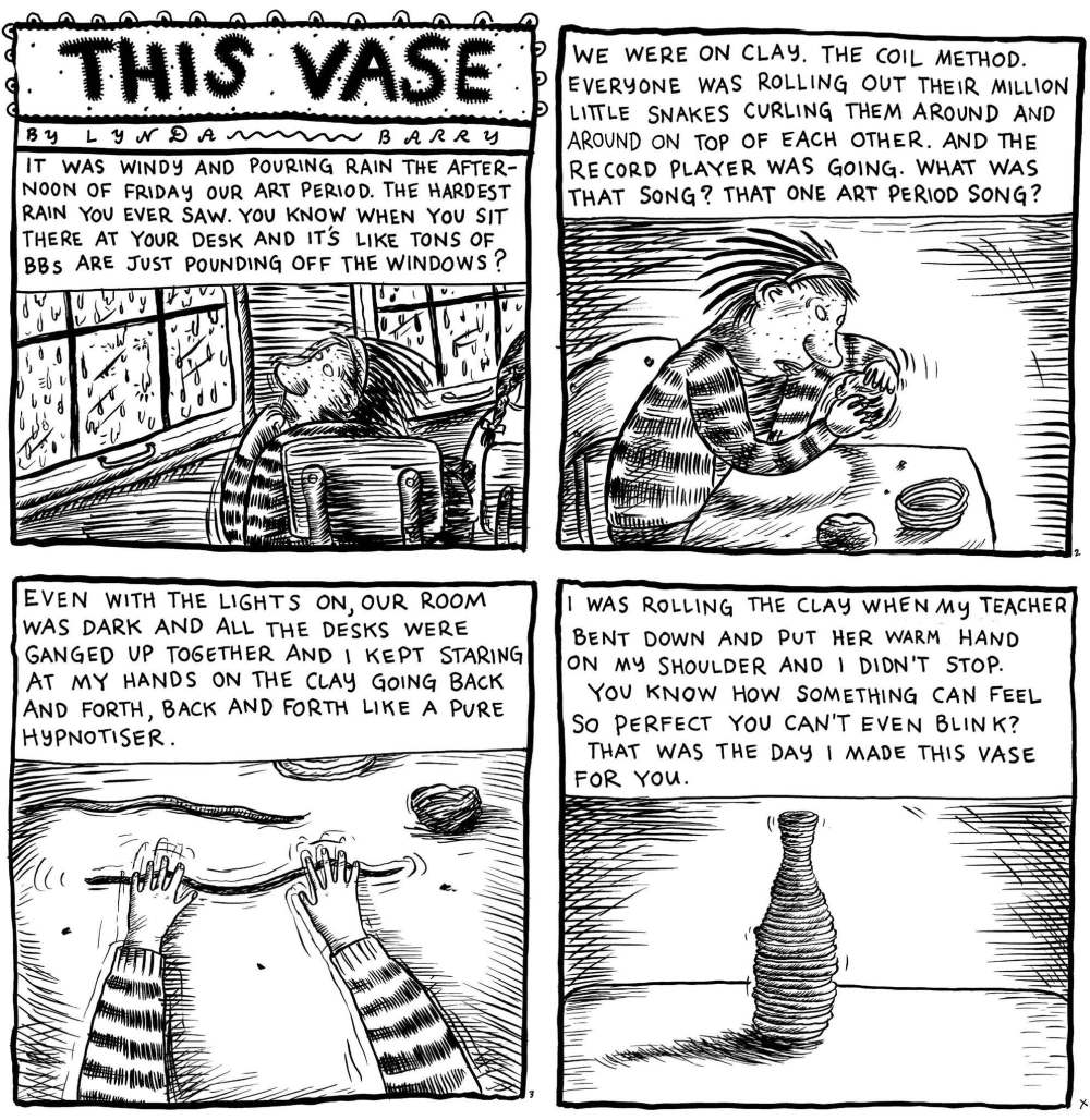 In the late 1990s, Barry published two coming-of-age novels, The Good Times Are Killing Me (adapted into a successful Broadway play) and Cruddy. These established her talent for representing the intense emotions of childhood and adolescence in a unique combination of humour, rawness and longing. More recently, she has published creative writing manuals that encourage readers to delve into their own early memories and experiences: What It Is, Picture This, and Syllabus: Notes from an Accidental Professor. She is now a professor of interdisciplinary creativity at the University of Wisconsin-Madison.