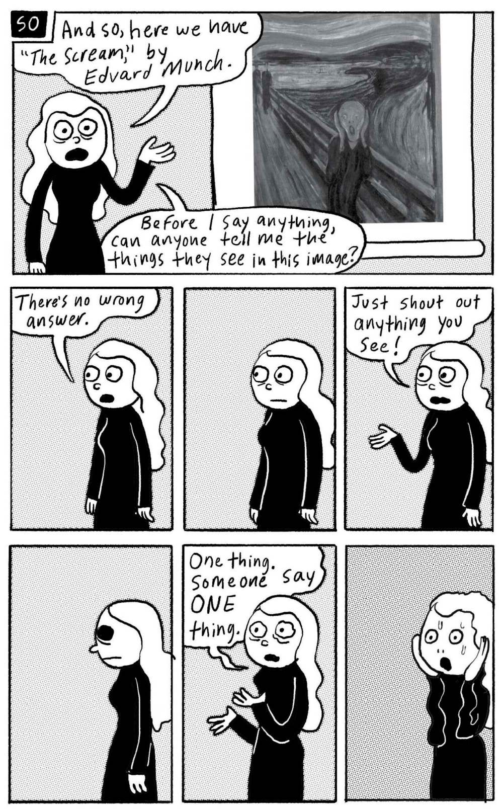 Amidst the drama, though, are some real opportunities for personal growth, as Wendy exhibits more agency than she has in previous volumes. She is able to sort out her personal life and art practice, while also acting like a responsible adult — her failure to do the latter has been, up until now, the very essence of her character. When put in charge of a group of undergrads, she at first experiences crippling impostor syndrome, but comes to realize she enjoys teaching, and in doing so potentially widens future career options for herself.