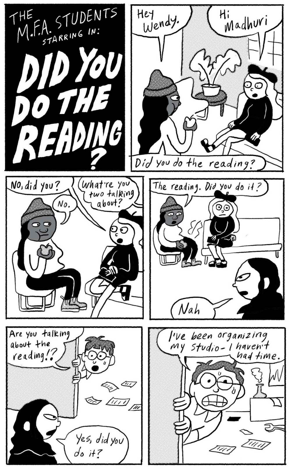 Wendy, Master of Art has a bit of a reality-TV feel, which is part of why the book also works so well as a stand-alone volume. With the same group of young people basically forced into close quarters with each other, alliances are formed, frenemies abound and hookups happen on the sly. If this MFA cohort isn’t in hell, they are most definitely at least in purgatory, with graduation as the only way out.