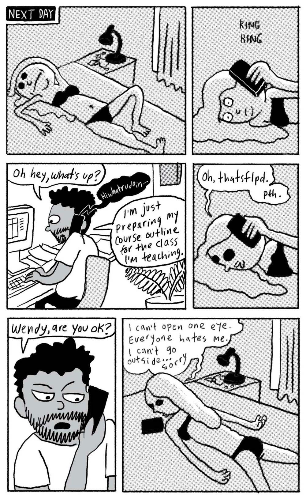 As Wendy and her classmates navigate their class projects and personal lives, Scott depicts them in stark black and white, looking frequently disheveled (bordering on slightly deranged), often with hollow eyes signaling stress, shame, a hangover, or often all three.