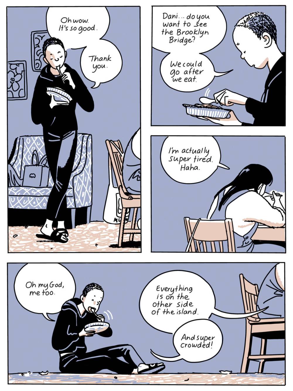 Audiences are also privy to whirlwind discussions in three distinct voices reflective of both cousins’ uncanny ability to capture acerbic adolescent dialogue. Between bouts of sightseeing, pizza-eating and, in Zoe and Fiona’s case, flirting, Jillian Tamaki’s knack for expressive character vignettes touch on queerness, race (all three are Asian-American — another great feature of this “girls trip” narrative) and class (Zoe is stressed about racking up roaming charges on her phone, which Fiona finds gauche).