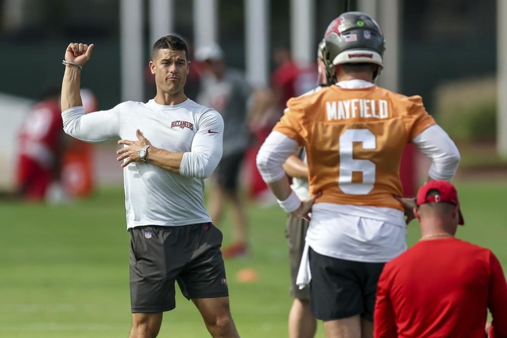 FILE - Tampa Bay Buccaneers offensive coordinator Dave Canales, left, talks with quarterback Baker Mayfield during NFL football practice Tuesday, June 13, 2023, in Tampa, Fla. The Carolina Panthers have agreed to hire Tampa Bay Buccaneers offensive coordinator Dave Canales as their new head coach, according to two people familiar with the situation. (AP Photo/Mike Carlson, File)