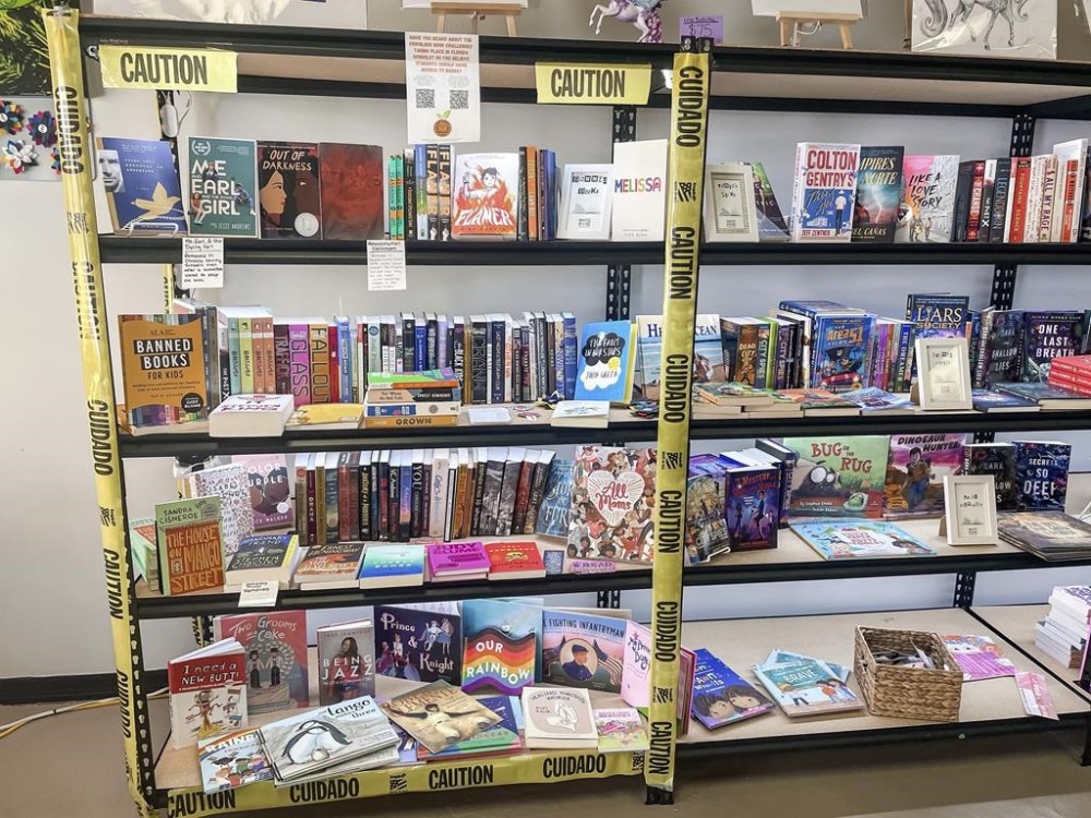 Various challenged books are surrounded by caution tape at the White Rose Books & More bookstore in Kissimmee, Fla. on Wednesday, May 22, 2024. (Erin Decker/White Rose Books & More via AP)