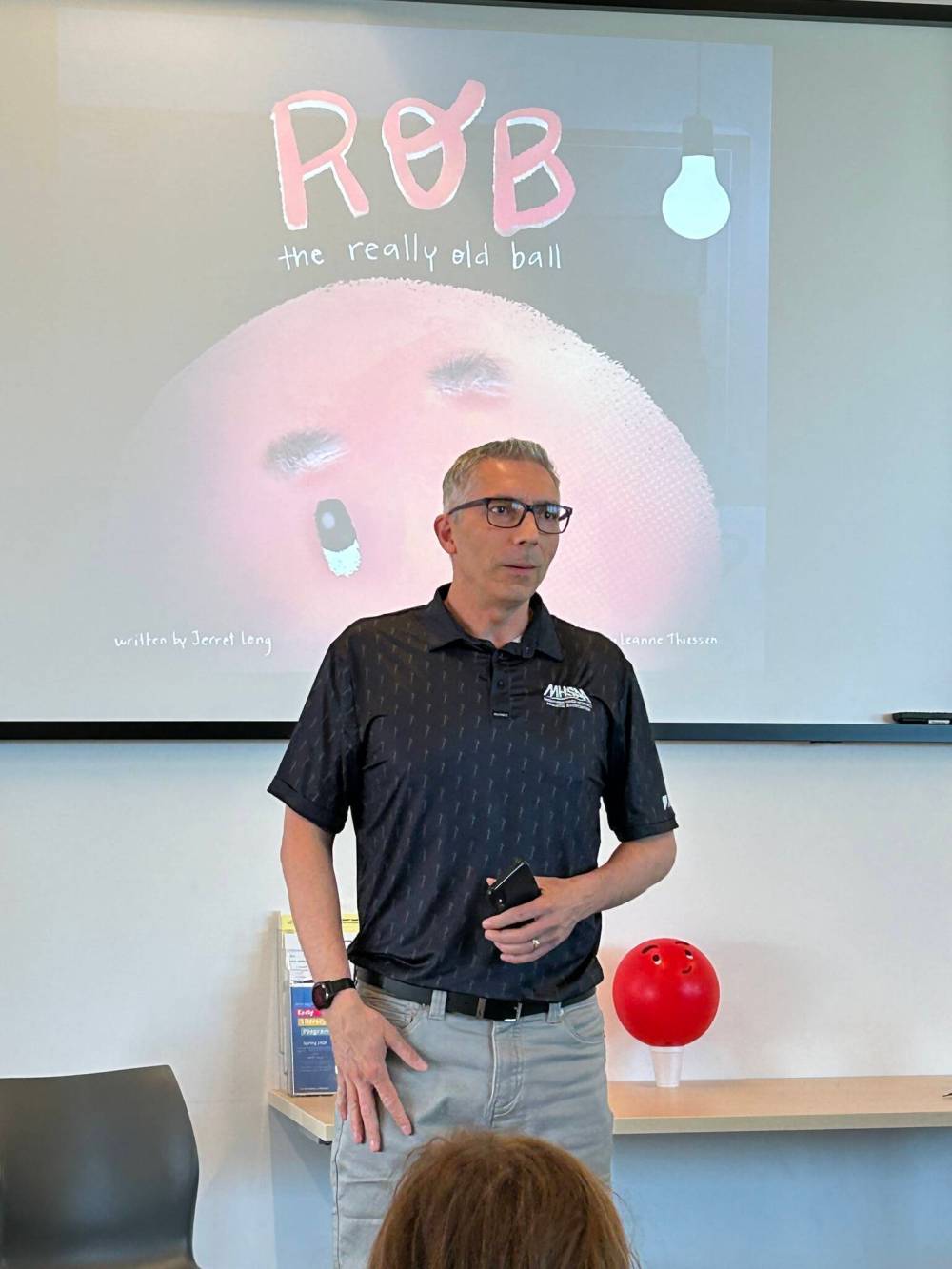 Supplied Bob, the really old ball Author Jerret Long talks to a classroom about his book.
