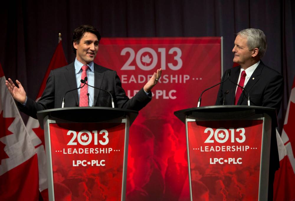 In this 2013 photo, Justin Trudeau (left) answers a question posed by Marc Garneau at a Liberal leadership debate in Halifax, N.S.