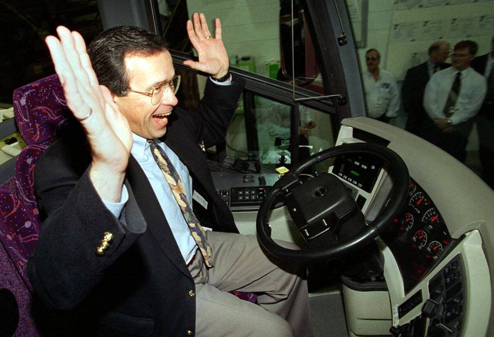 In this 1996 photo, then-Premier Gary Filmon checks outa new bus at Motor Coach Industries’ Winnipeg plant.