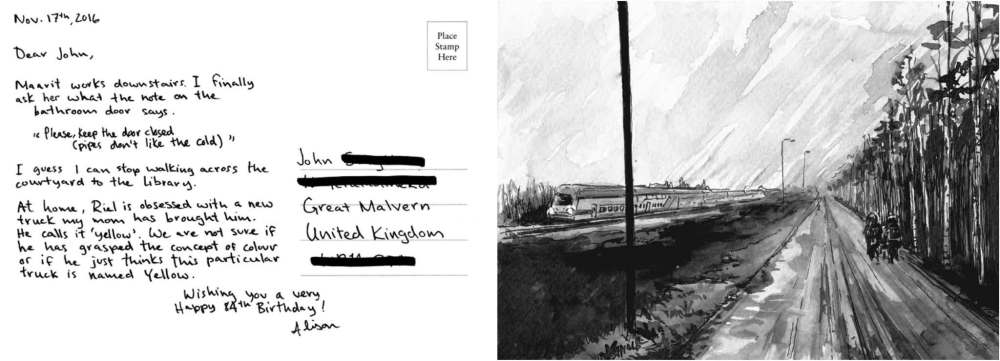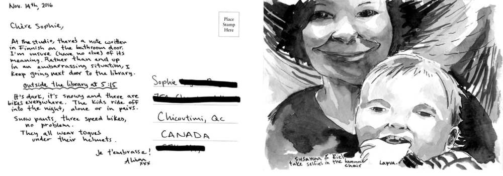 In Norths, the postcards depict everyday scenes of the places she is living in detailed black-and-white illustrations of landscapes, cityscapes, interiors, people and common objects. Whereas postcards traditionally show grand and monumental scenes, these sketch the much more banal scenes of daily life in circumpolar villages, towns and cities, such as “Looking for the library in Qaqortoq (Greenland), walking behind a group of teenagers” and “The view from our bed. Petrozavodsk, Russia.”