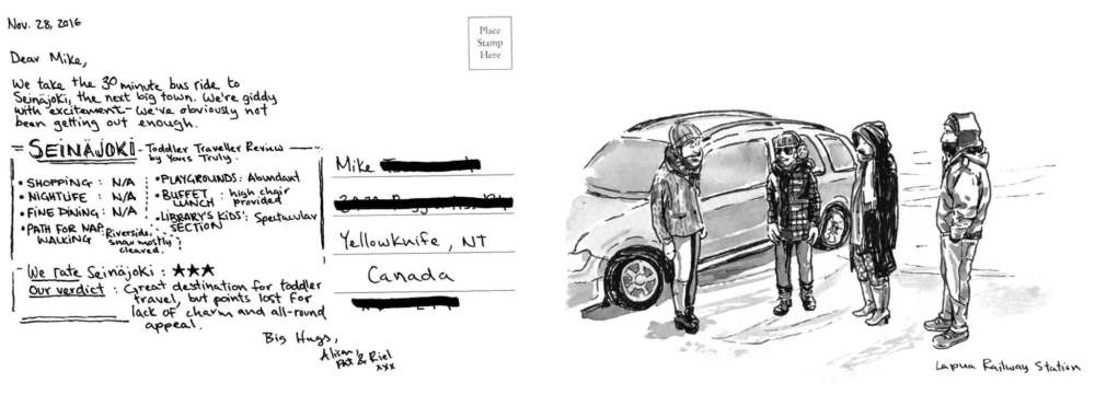 On the back of the postcards, McCreesh’s lively mini-narratives of that day’s events are written with the immediacy and intimacy of a diary. While she does draw some maps, provide historical and cultural information and reflect on the similarities and differences between circumpolar places, there is little of the classic travel writer’s wondrous or exoticized gaze on foreign places and people.
