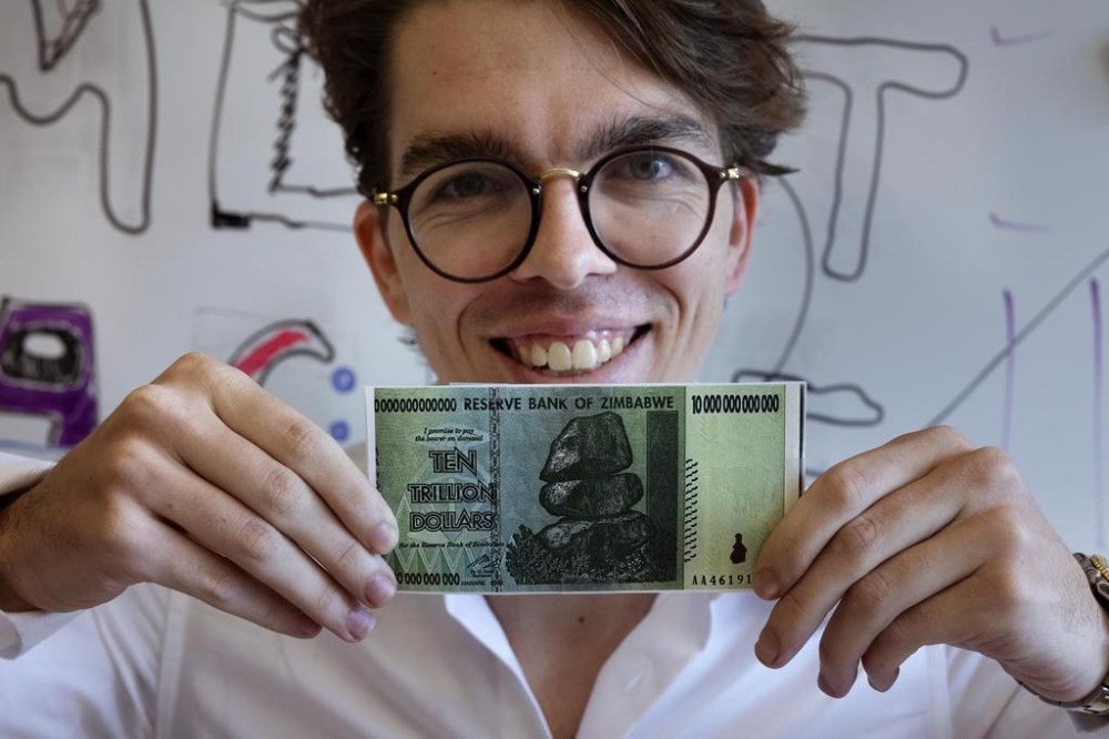 Eric Martinez, a graduate student in the Department of Brain and Cognitive Science at the Massachusetts Institute of Technology, holds a Zimbabwean $10 trillion bill, Friday, Sept. 9, 2022, in Cambridge, Mass. Martinez, who also has a law degree from Harvard University, shared the literature Ig Nobel with Francis Mollica and Edward Gibson for analyzing what makes legal documents unnecessarily difficult to understand. The 32nd annual Ig Nobel prize ceremony on Thursday, Sept. 15, 2022, was for the third year in a row a prerecorded affair because of the lingering effects of the coronavirus pandemic. (AP Photo/Michael Dwyer)