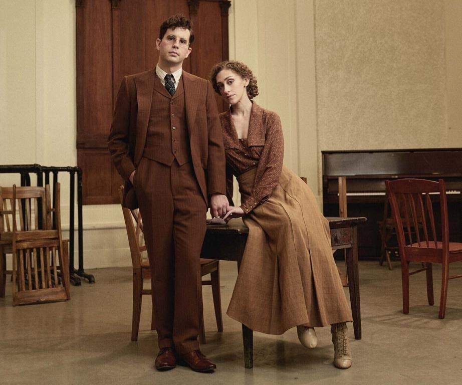 The set design by Dane Laffrey and projections by Sven Ortel mix photos and physical furniture around a raised smaller central platform, curiously eschewing the benefit of having the Bernard B. Jacobs Theatre’s stage. This platform concentrates the action, becoming a little ballroom, bedroom, jail cell, graveyard, newspaper office and courtroom. It’s busy and yet also plain — like the top of a wedding cake — so the show is often over-reliant on Heather Gilbert’s lighting for tone.