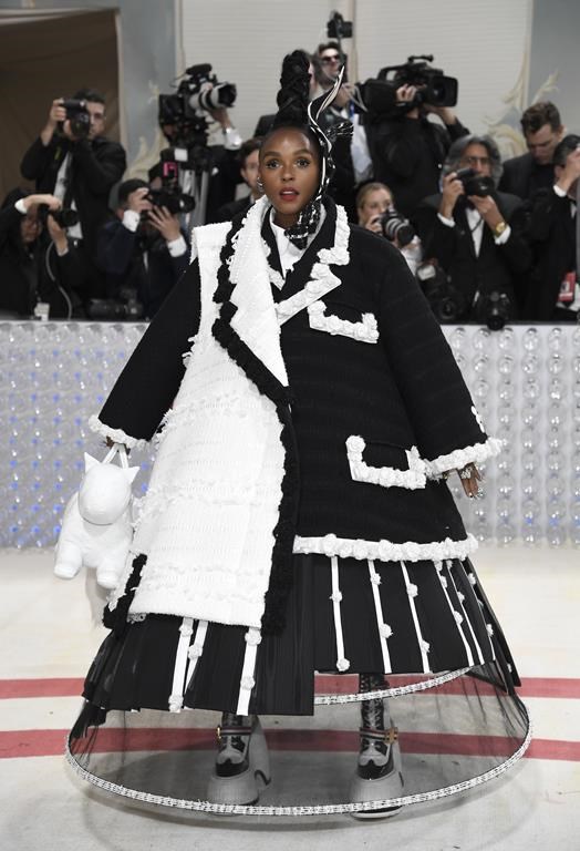 NEW YORK (AP) — Rihanna shut down the Met Gala carpet Monday encased in white camellias on a jacket with a long train gown. Janelle Monáe dropped a bulky coat to reveal a see-through cage and Jeremy Pope walked in a 32-foot cape emblazoned with the visage of Karl Lagerfeld.